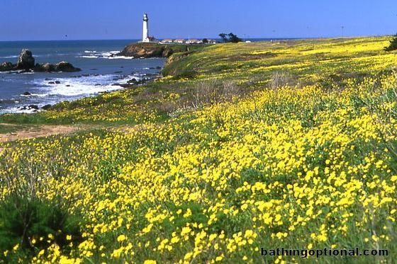 Spring wildflowers in bloom with Pigeon Point lighthouse on the horizon. United States, Half Moon Bay - 06-Mar-04