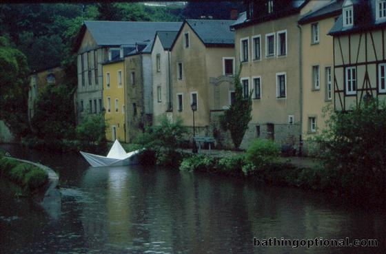 Giant paper hat boat floating in one of Luxembourg Citys canals down in the area known as The Grund. Luxembourg, Luxembourg City - 19-May-03
