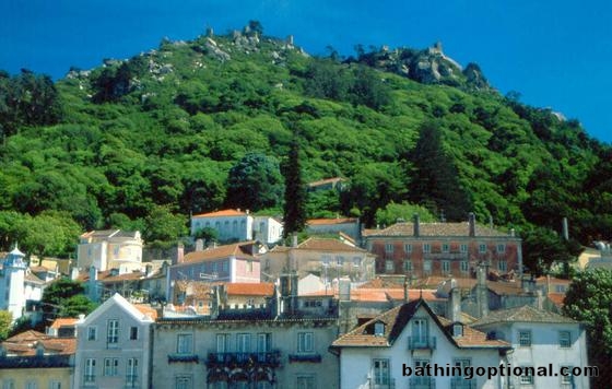 View over central Sintra with its ancient Moorish fortress ruins above. Portugal, Sintra - 10-Jun-03
