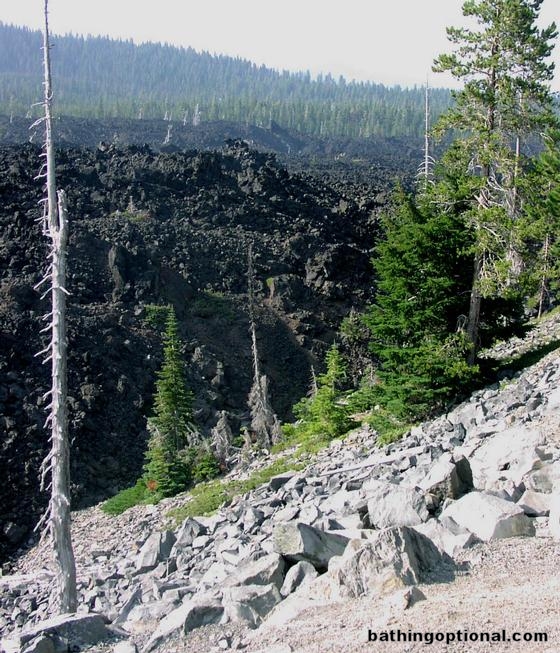 Lava flow landscape -- pines somehow growing out of fields of rock. United States, Cascade Lakes Highway - 29-Jul-04