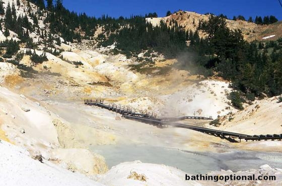 View of Bumpass Hell landscape with elevated walkway. United States, Lassen Volcanic National Park - 06-Aug-04