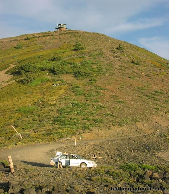 Ashe and our poor little car at the end of a tough drive. The Mt.Burney fire lookout station can be seen up above. United States, Mt.Burney - 06-Aug-04