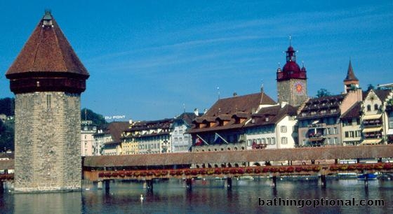 Luzern, one of Switzerlands most visited lake-side towns. Here, the famous wooden bridge stands intact following many fires over the centuries. Switzerland, Luzern - 09-Jul-03