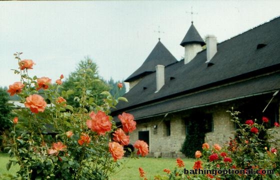 At one of the larger painted monasteries, the chapel sits in the heart of a large, walled complex. Romania, Moldavia - 29-Aug-03