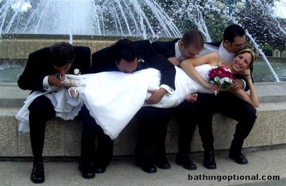 Groomsmen kissing the bride.