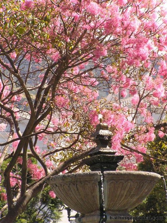 Blossoming tree and fountain in the Old Town´s main square, the Plaza de la Independencia. Ecuador, Quito - 05-Jul-06