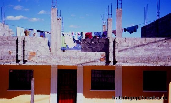 Typical Ecuadorian home -- cement, colorful and beams and sticking up from the roof ready for the day when theyre ready for the second floor. Ecuador, Otavalo - 08-Jul-06