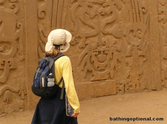 Ashe checking out the incredible carvings along the wall of the Esmeralda Pyramid. Peru, Trujillo - 07-Aug-06