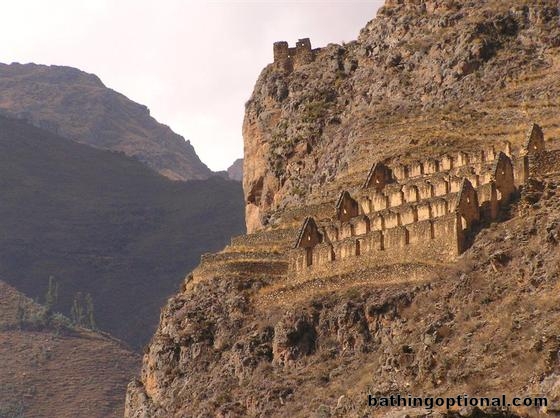 Incan buildings sit high on the steep mountain above Ollantaytambo.