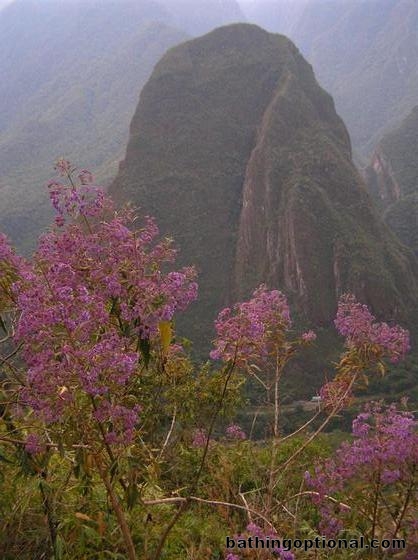 A spearhead-like mountain sits right in the middle of the very deep valley on one side of Machu Picchu. Peru, Machupichu - 25-Aug-06