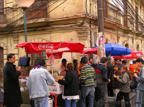 Early in the morning the saltena vendors open shop and welcome the droves of loyal saltena eaters. We were hoping for veggie saltenas but there were none to be found. Bolivia, La Paz - 16-Aug-06