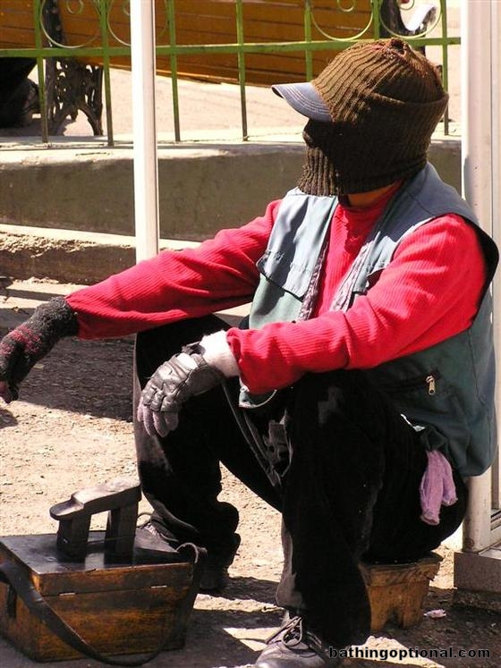 Shoeshine boy. They keep themselves covered for the shame of their profession. Bolivia, La Paz - 16-Aug-06
