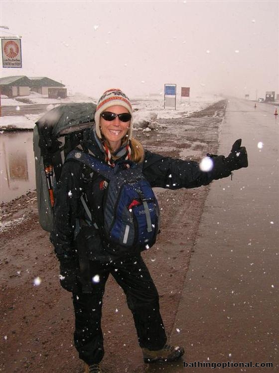 Hitching a ride 25 km. further down the road to the Argentina-Chile border was tougher than we thought! We waited a long, long time... Argentina, Penitentes - 21-Sep-06