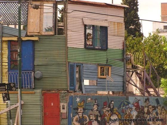 Entering Buenos Aires La Boca district, with this mural/art piece on the first corner. La Boca is the old port area and long-time working class neighborhood. Today it is also home to the world famous Boca Juniors football club. Argentina, Buenos Aires - 30-Oct-06