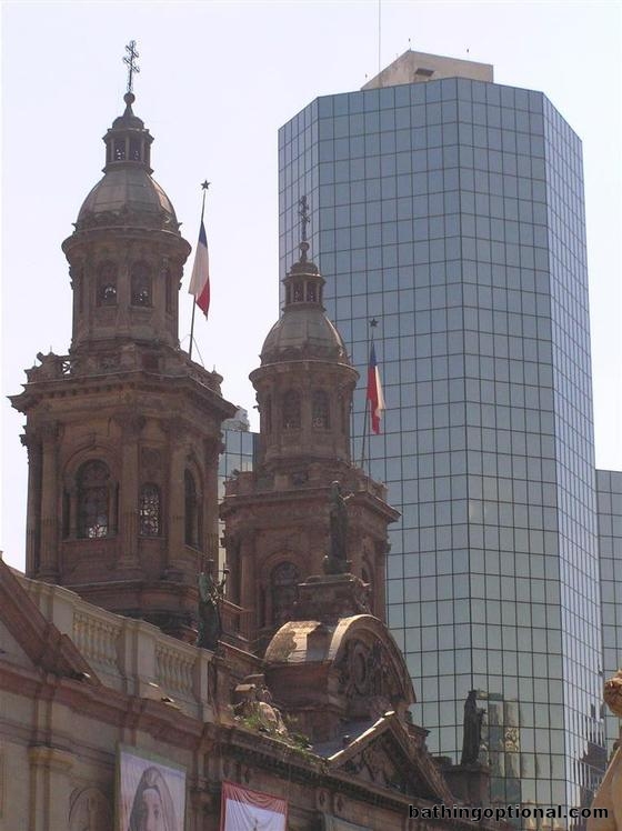 Santiago´s main plaza and main cathedral are dwarfed by modern glass towers. Chile, Santiago - 24-Sep-06