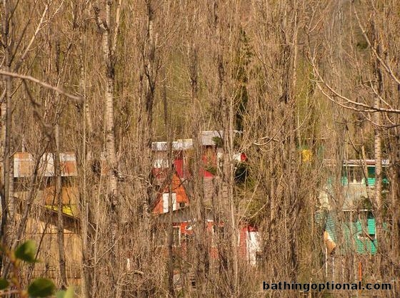 View of the colorful village from our campsite through bare poplars. Chile, Maipo Canyon - 25-Sep-06