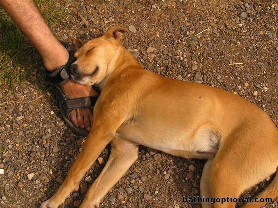 As usual, we befriended the local pack of wild, street dogs. Here, Mini Mange, as we dubbed him, fell asleep on Maciejs foot. Chile, Maipo Canyon - 25-Sep-06