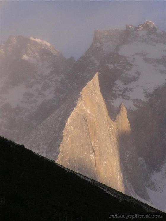 Early morning sunlight on peaks at the end of Valle del Frances. Chile, Torres del Paine National Park - 24-Oct-06