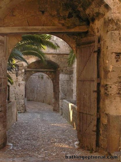 Passing through the old city wall involves passing through several gates and over the old moat. Greece, Rhodes - 19-Nov-06
