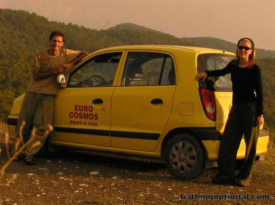 Us with our latest hotel room on wheels, our 25 Euro Hyundai Atoz. Greece, Askliplio, Rhodes Island - 20-Nov-06