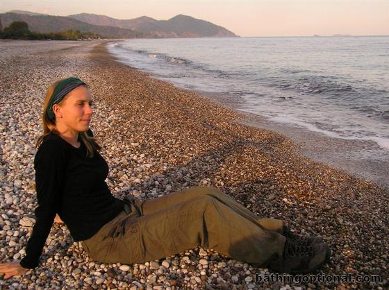 Ashe on the beach, relaxing before our 7 km. sunset hike to the ancient natural flame known as the Chimaera. Turkey, Olympos - 24-Nov-06