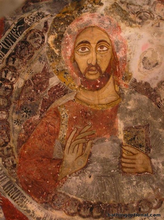 Giant Jesus inside the church, painted right onto the cave which makes the roof of the church. Turkey, Sumela Monastery - 06-Dec-06