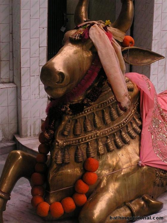 Nandi the bull with necklace of oranges watches over the sacred source of Manikarans hot waters. India, Manikaran - 11-Mar-07