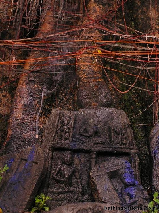 Sacred (old) tree wrapped in string and surrounded by offerings.