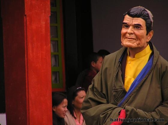 The comedic relief between masked lama dances involved Reagan and some other clowns running around and whipping audience members with cloth straps. India, Rumtek - 16-Feb-07