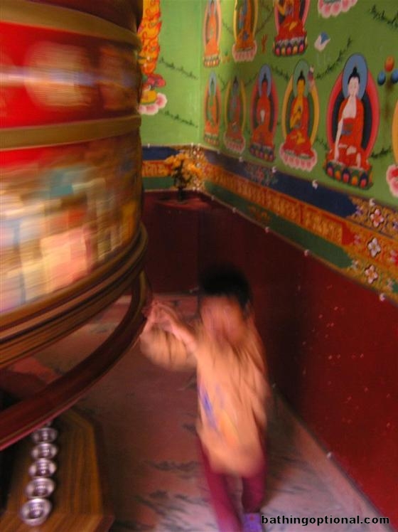 A young boy spins one of the giant prayer wheels at the monastery.
