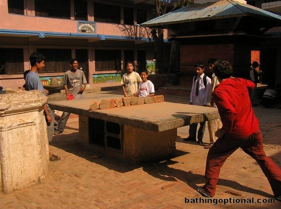 Walking through the lanes of southern Kathmandu in the Teku district, we found some kids playing ping pong on a table of concrete and net made of bricks. Maciej couldnt help but join the game. Nepal, Kathmandu - 29-Mar-07