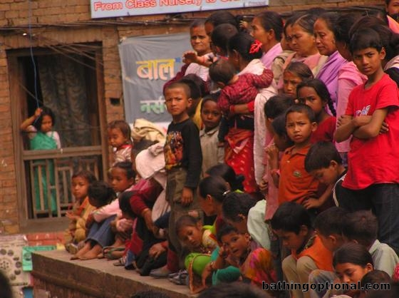Watching the action as the two groups carrying shrines from opposite ends of town battle it out in the small square. Nepal, Bhaktapur - 15-Apr-07