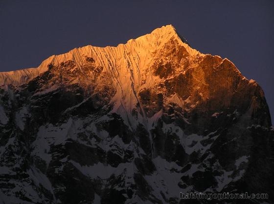 Day 3 : Thami to Tengboche.\r\nSunrise colors one of the peaks over Thami. Nepal, Mt. Everest - 02-Apr-07