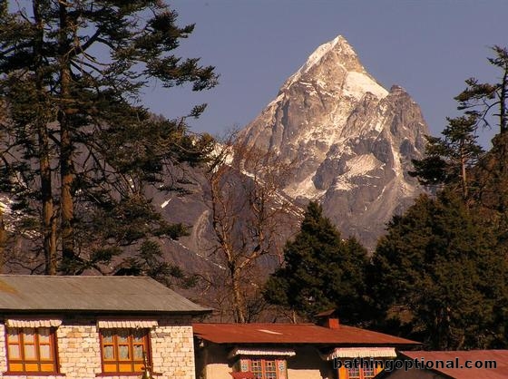 Day 4 : Tengboche to Dingboche.\r\nJagged peak over Monstery lodging. Nepal, Mt. Everest - 03-Apr-07