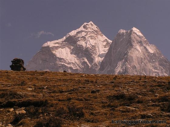 Day 5 : Dingboche to Dugla.\r\nMountains peaking over the ridge at Dingboche. Nepal, Mt. Everest - 04-Apr-07