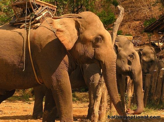 Elephants ready for riders in the forest just outside Mae Hong Son. Thailand, Mae Hong Son - 01-May-07
