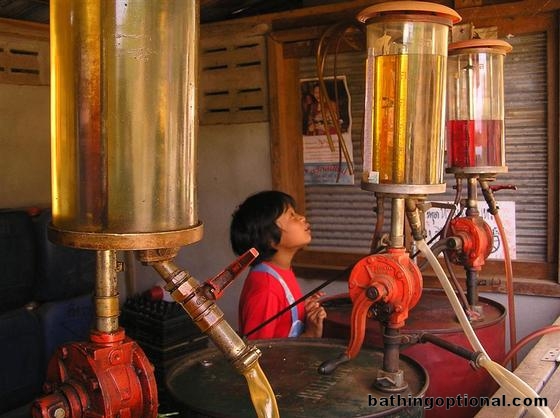 This was the only gas station around for miles and miles. This little girl worked the old school pumps that pumped out petrol in one liter bursts. Thailand, Mae Hong Son - 01-May-07