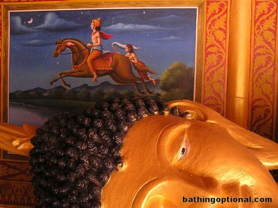 Reclining Buddha with Siddarthas flight from the palace scene behind him.