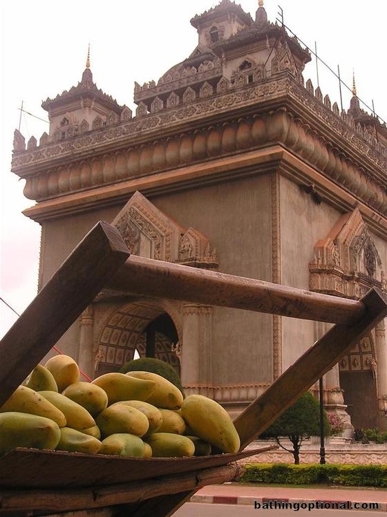 Umm... a cart full of delicious, ripe mangos sits at the side of the road by Vientianes Independence Gate. Laos, Vientiane - 12-May-07