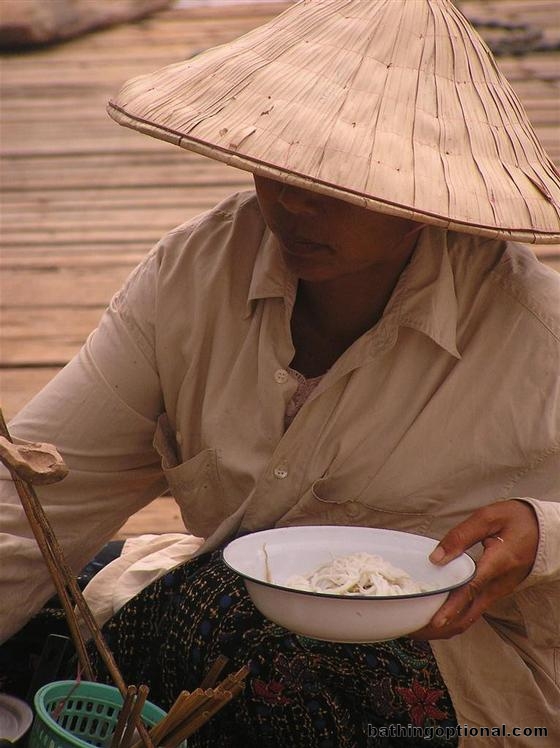 Another fast food woman gets a bowl of noodles ready for a passenger as we wait for the barge to cross the Mekong River to Champasak. Laos, Savannakhet - 15-May-07