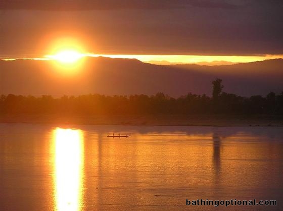 A new day! The rising sun was caught between the mountains and a thick layer of clouds for a brief minute or two at about 5:38 a.m. Laos, Champasak - 15-May-07