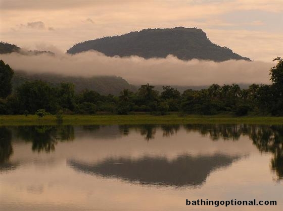 Mountain reflection in one of the ponds at the Wat Phu temple ruins site. Laos, Champasak - 15-May-07
