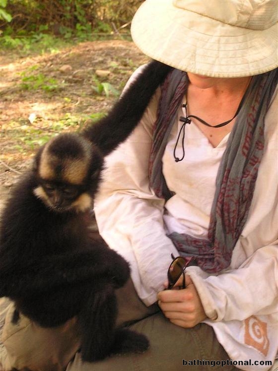While taking breaks from swinging in the trees and running around, our favorite monkey in the world would sit in Ashes lap and put his arms around her neck. Laos, Si Phan Don - 16-May-07