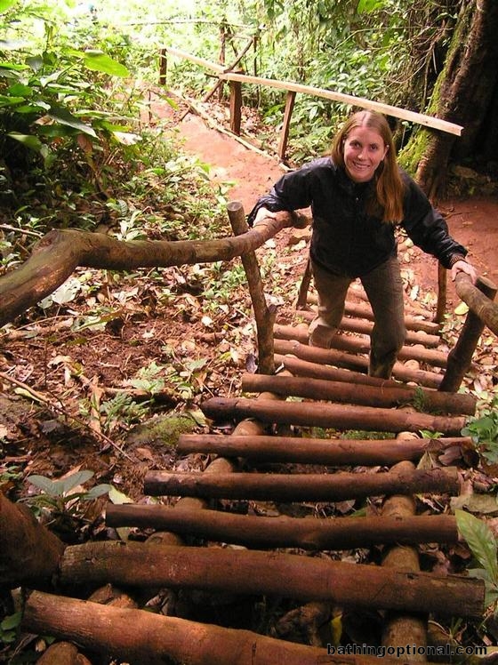 Ashe climbing down a wood ladder, heading for our favorite of Bolavens waterfalls, Tad Kyeung Falls. Laos, Bolaven Plateau - 19-May-07