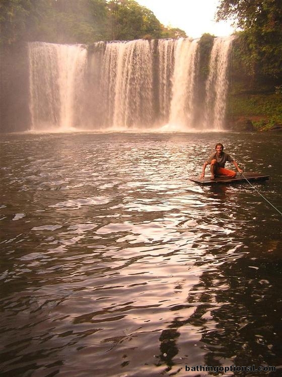 Wow, what a great idea! Bamboo raft with rope connecting it to the waterfall. We pulled ourselves right up to the falls. Laos, Bolaven Plateau - 19-May-07