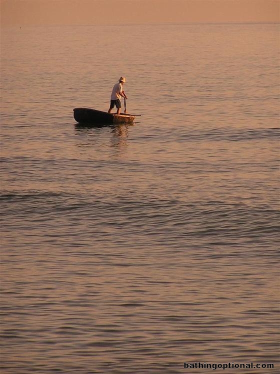Early morning fisherman in a typically Vietnamese round bamboo vessel.