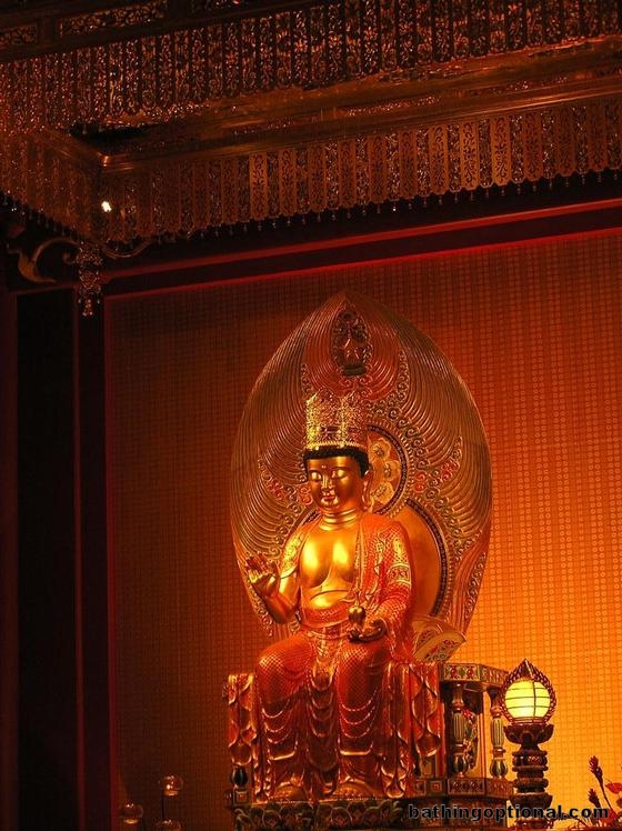 The subtle, yet impressive, main altar and image inside the Buddhas Tooth Temple. Singapore, Singapore City - 21-Jun-07