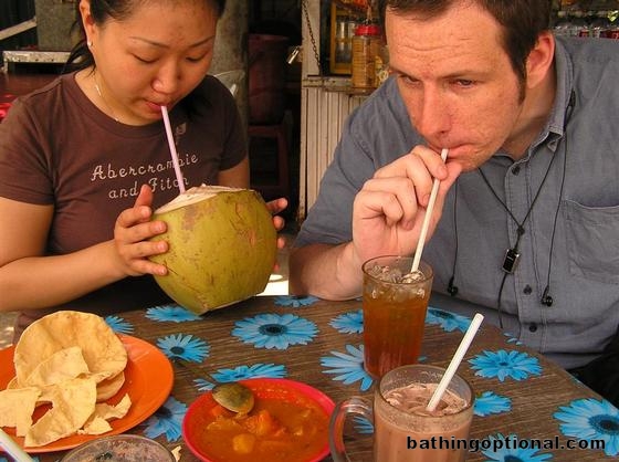 Nothing beats cold drinks at one of KLs hundreds and hundreds of streetside restaurants. Wai Leng drinks from a coconut, Jamison some lime tea, and our Milo ice sits chilling.