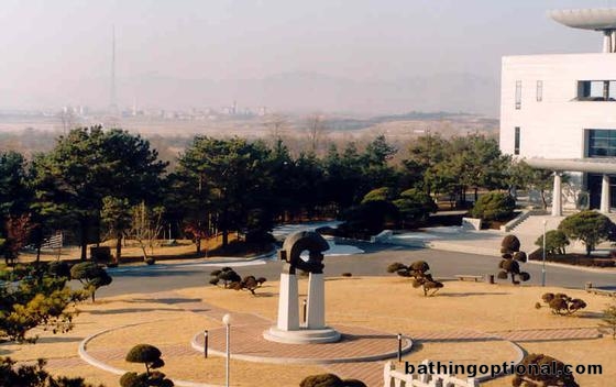 This is as close as we ever got to North Korea. Panmunjeom is the heavily-touristed United Nations outpost located at the DMZ, the 2km-wide no-access zone separating North and South Korea. In the distance can be made out the Norths propaganda town, a farce of a city and collection of false building facades. Like some abandoned movie set, the propaganda town sits idle while pro-communist North Korea slogans are blurted out the huge speakers hanging off the contender for the worlds highest flag pole. \r\nOnly one other time did we get so close to the North. That was while overnighting it in Seoraksan National Park. Not far from our mountain hut, we could see the lights of military outposts and wandering soldiers in the hills to our north. \r\nThese days, re-unification is high on many Koreans list of priorities. South Korea, Panmunjeon - 20-Dec-01