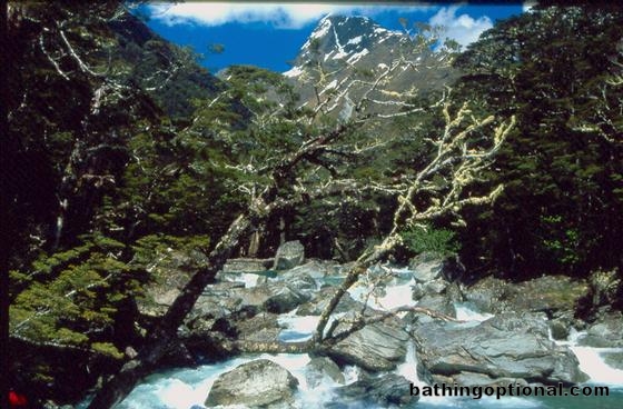 Crossing a rushing stream, Routeburn Track.